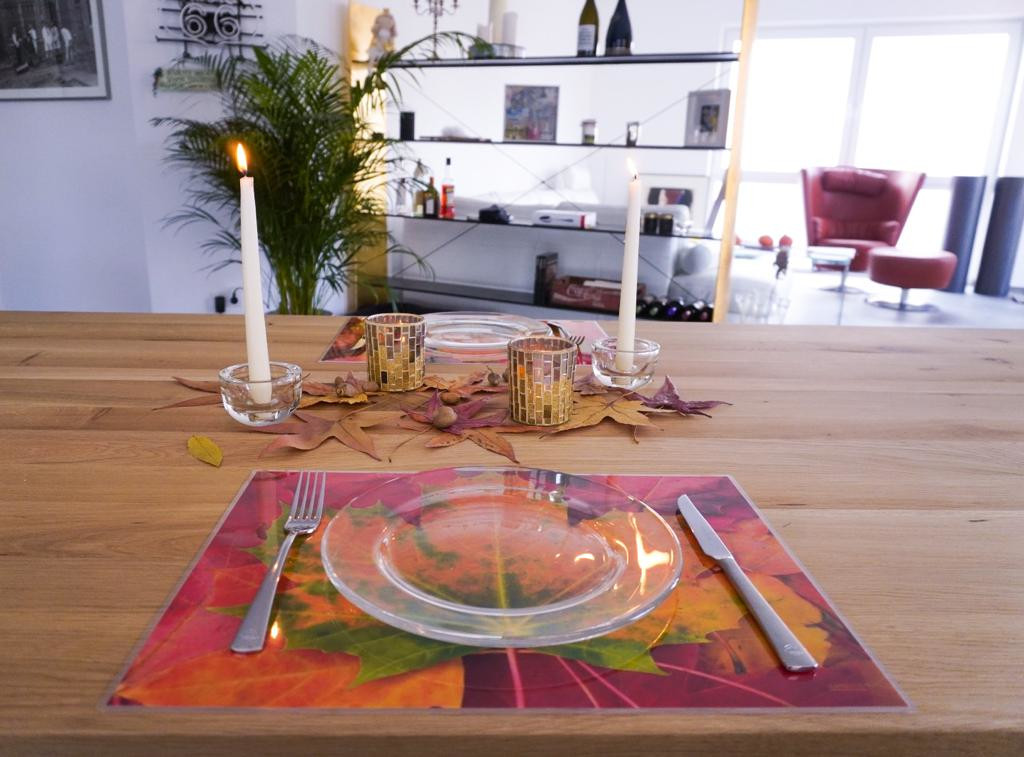 Tischset abwaschbar 42x30 cm, hochwertiges Kunststofflaminat in 2x 250 Micron Stärke, umlaufender transparenter Rand von ca. 3 mm Breite und abgerundeten Ecken- herbstliches Bildmotiv mit Kastanien