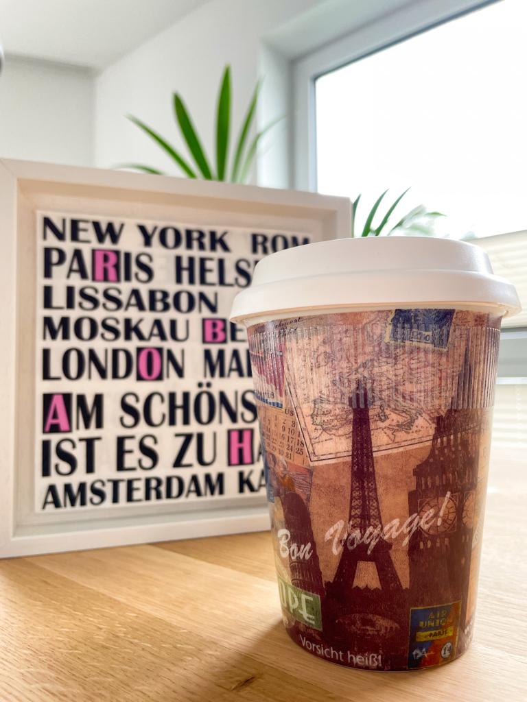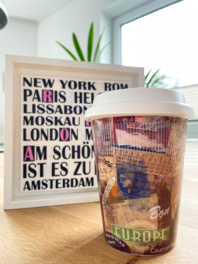 Coffee-to-Go-Becher von Könitz aus hochwertigem Porzellan inkl. Silikondeckel (der wirklich funktioniert und beim Trinken keine undichten Stellen hat!).