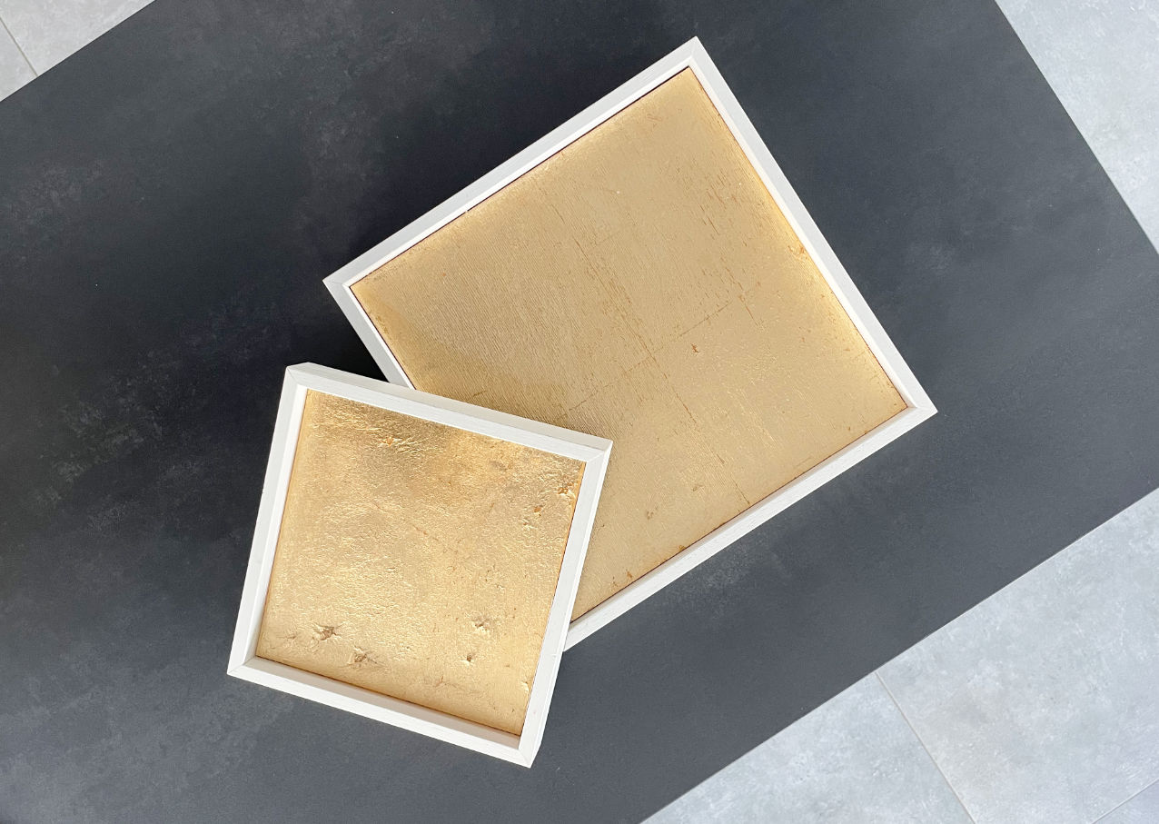 Der weiß lackierte Rahmen mit natürlicher Holzstruktur und die mit Blattgold, Blattsilber oder Oxydmetall veredelte und mit Epoxydharz versiegelte Innenfläche ergeben eine einzigartige Komposition. Das edle Tablett eignet sich hervorragend für Ihre Kerzendeko, jede edle Tischdekoration zur Saison oder als außergewöhnliches Serviertablett für kleine Köstlichkeiten. Das Tablett besitzt eine Filzunterseite für maximalen Komfort in der Handhabung.