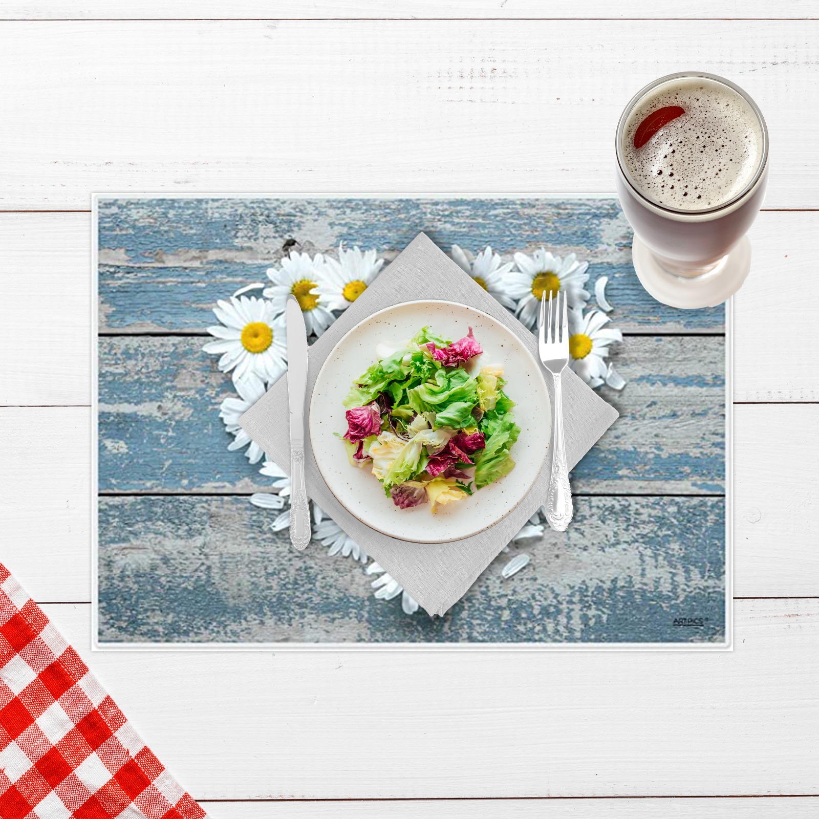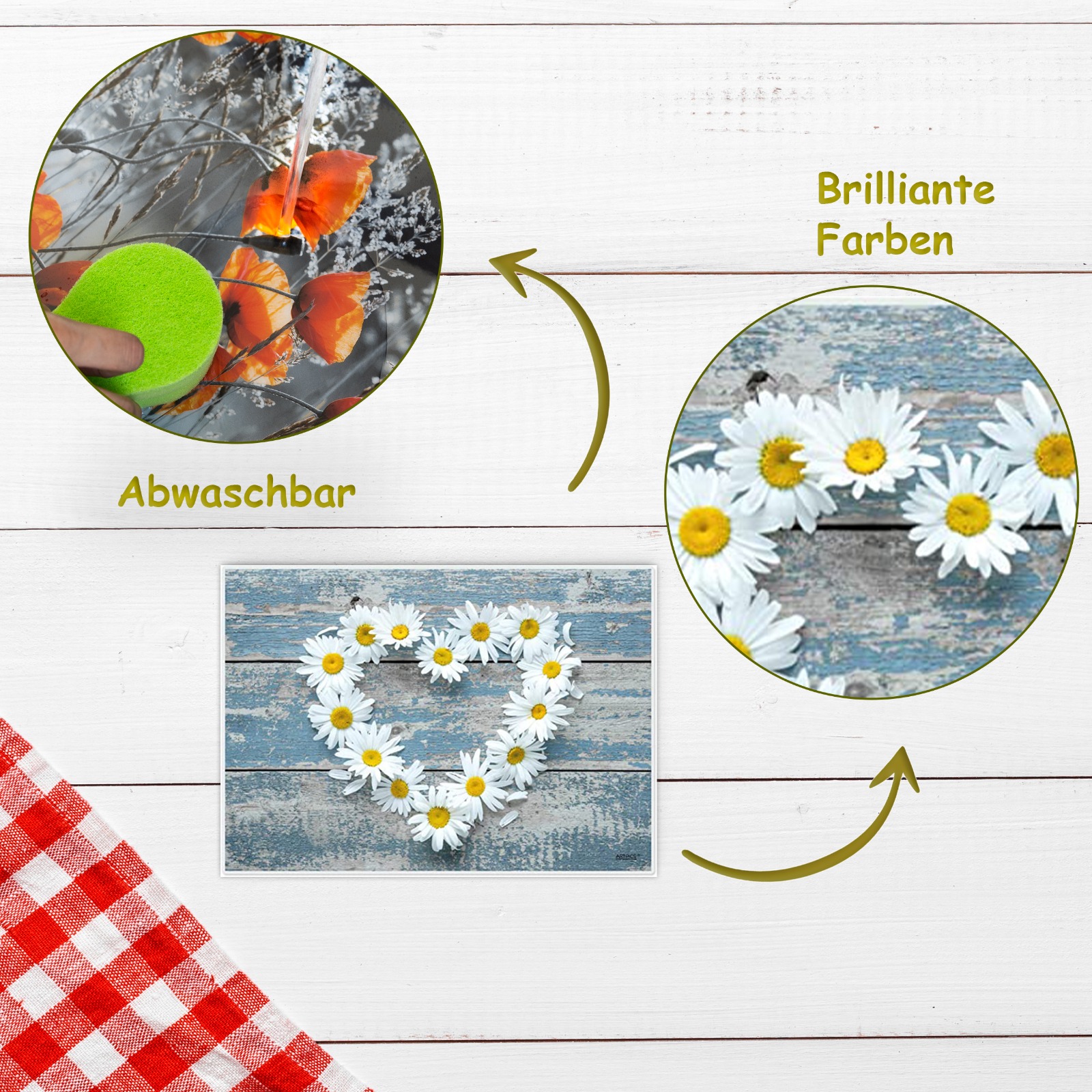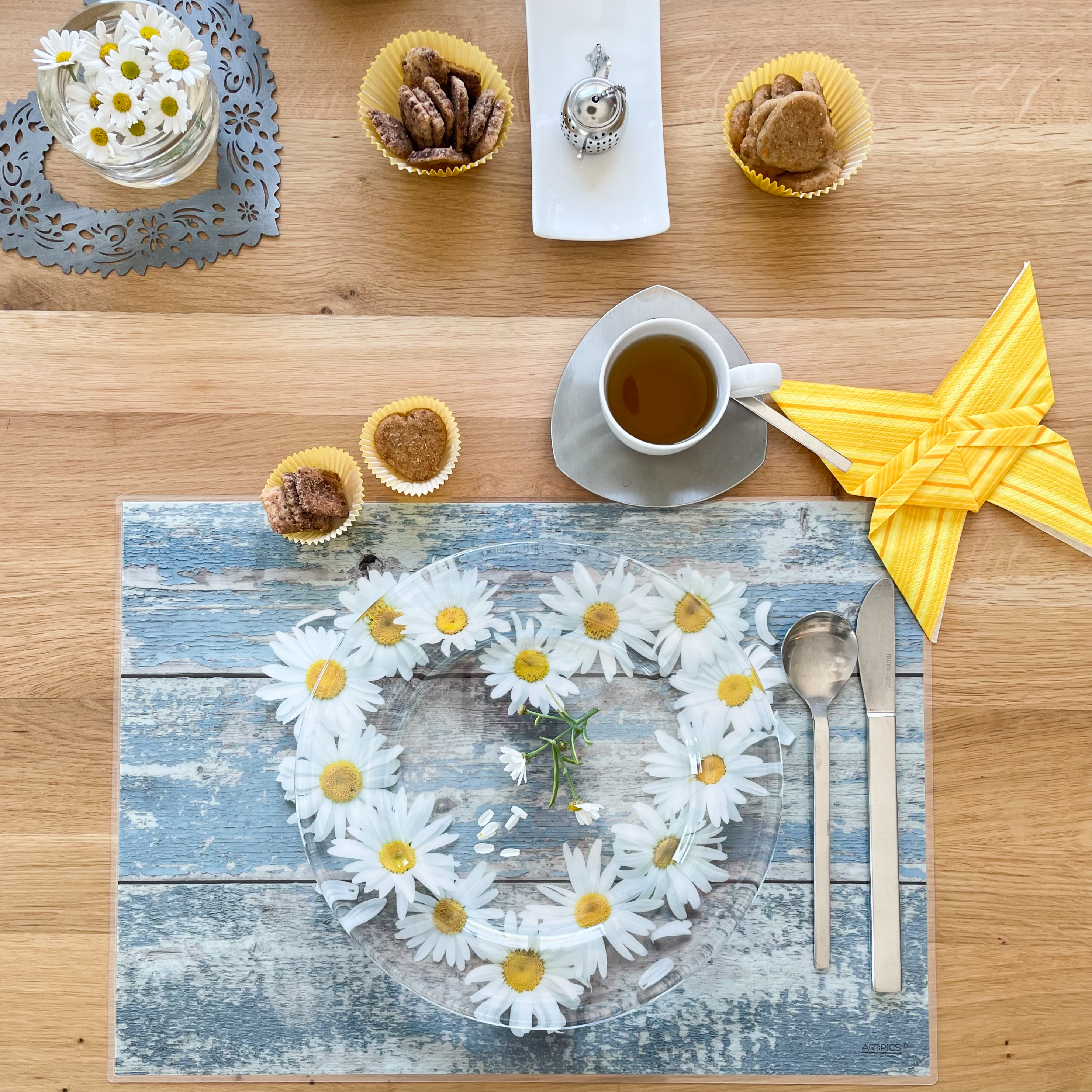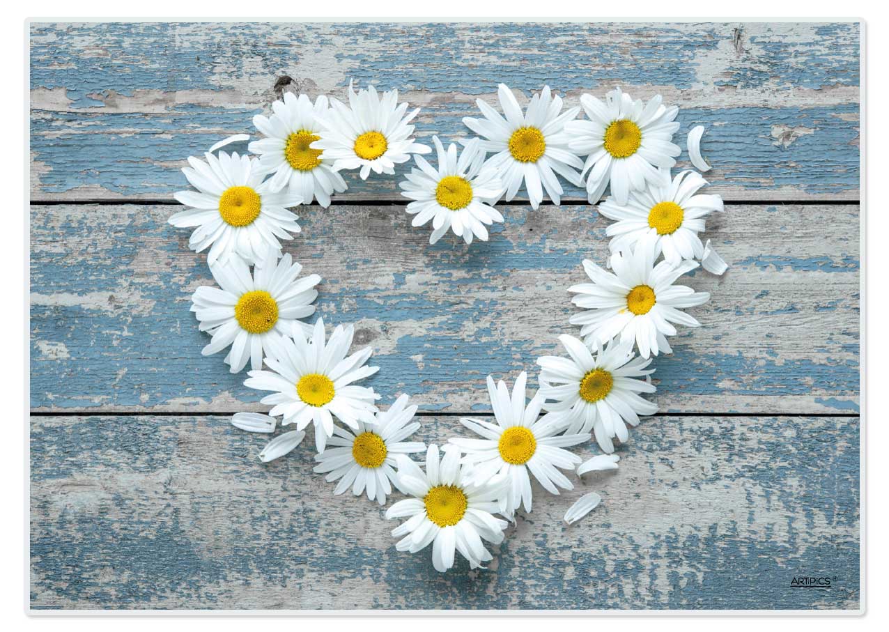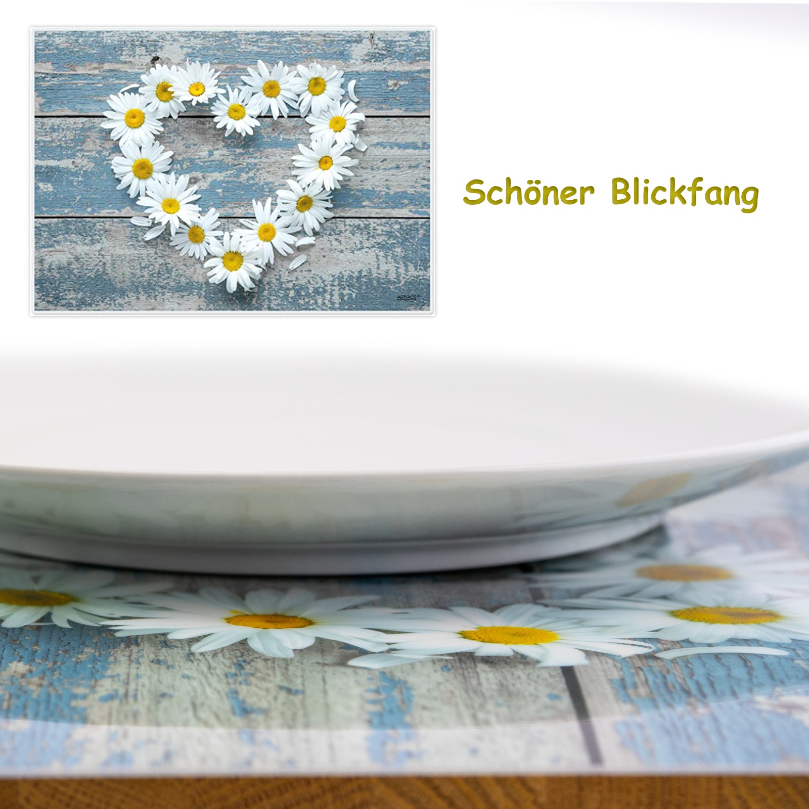Wussten Sie, dass die Margerite im griechischen Altertum der Aphrodite, der Göttin der Liebe und der Schönheit, geweiht war? Übrigens ist sie auch eine der typischen Orakelblumen.... sie liebt mich, sie liebt mich nicht (oder er? ;-).... Im Haus sollen Margeriten für Harmonie und Freude sorgen. Damit ist doch fast alles gesagt, oder? Uns gefällt unser Tischsets Daisy Heart so gut, weil es ein bisschen verspielt, aber doch ganz klar in Form und Farbe ist. Ein Tischset mit 'einfacher' Schönheit- wie die Margerite selbst. Originalfoto für unser Tischset: © alexraths- Depositphotos