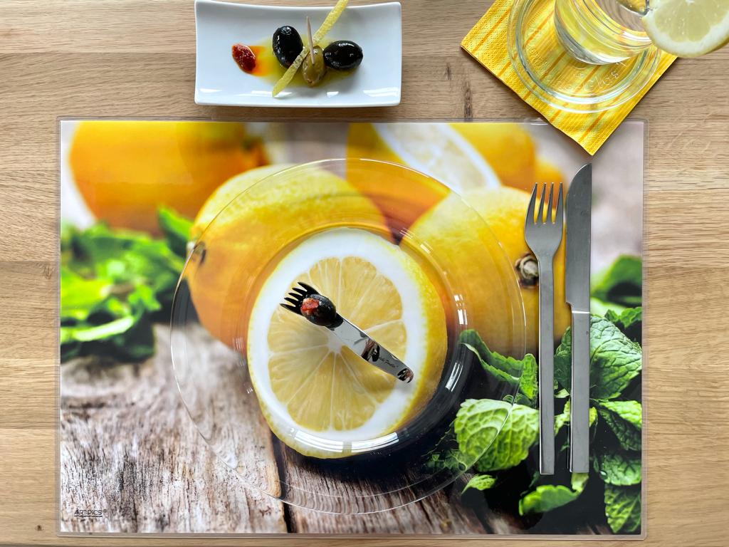 Zitronen und Minze- frischer geht es nicht im Sommer! Ein Tischset, das sofort italienisches Sommer-Gefühl verbreitet. Unser Tipp zur schnellen Deko: echte Zitronen auf den Tisch, ein paar Kräuter und sonnengelbe Servietten dazu und sofort Sommerfrische genießen! Ihre Gäste werden begeistert sein.