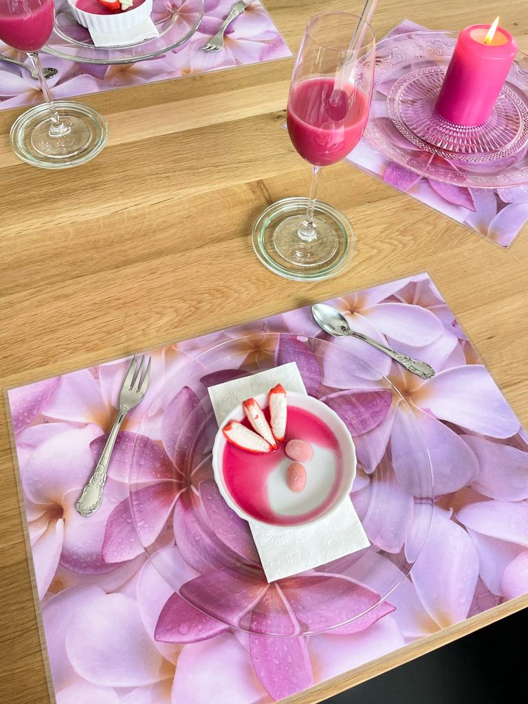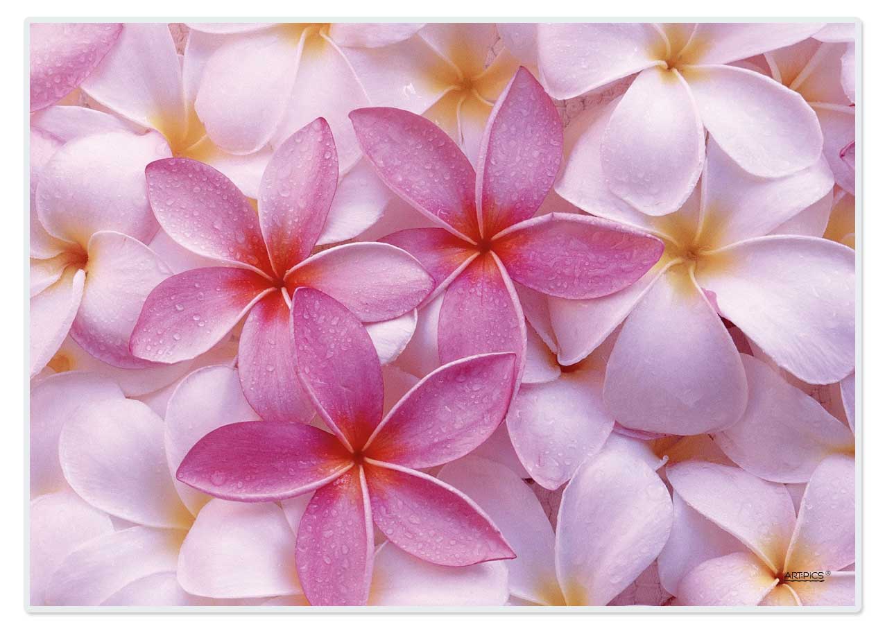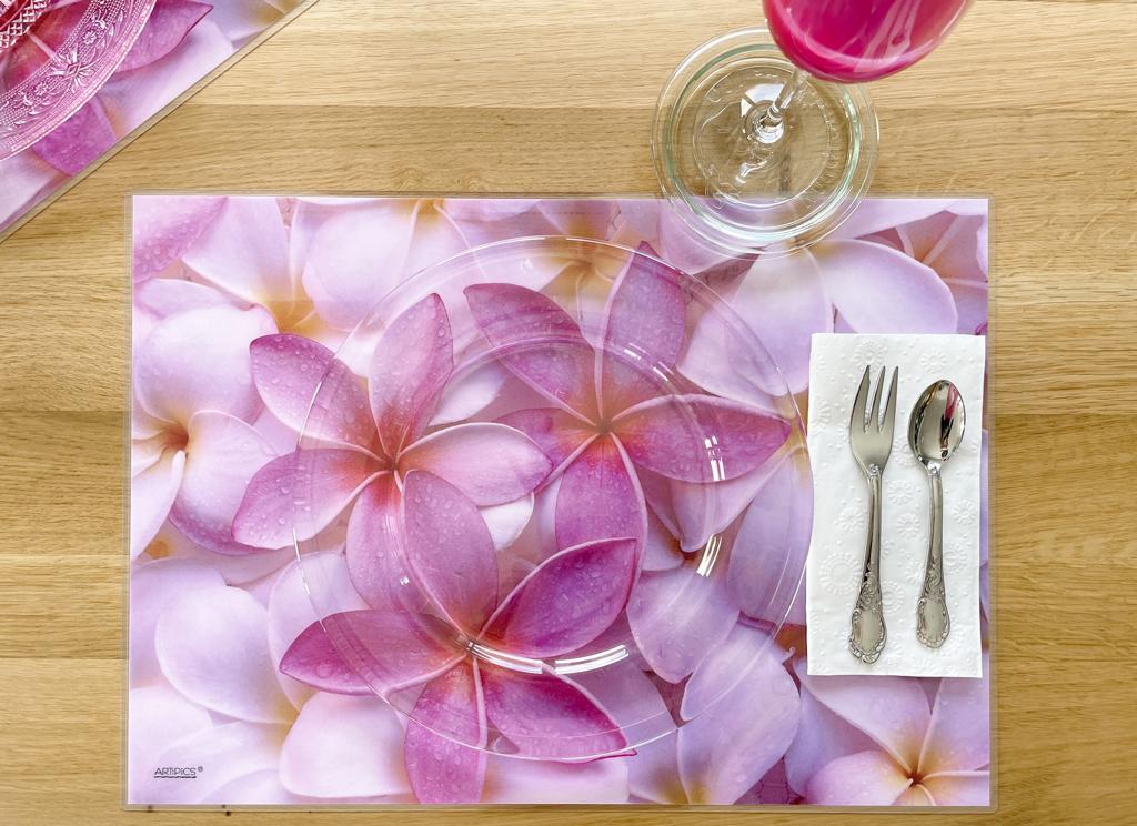 Exotische Blüten und Südsee-Feeling pur! Unser Tischsets "Frangipani" ist intensiv in der Wirkung, aber nicht bunt, und auf jeden Fall sommerlich! Originalfoto für unser Tischsets: © Qiu Ruyu * * * * * Alle unsere Tischsets haben einen umlaufenden transparenten Rand von ca. 3 mm Breite und abgerundete Ecken. * * * * *