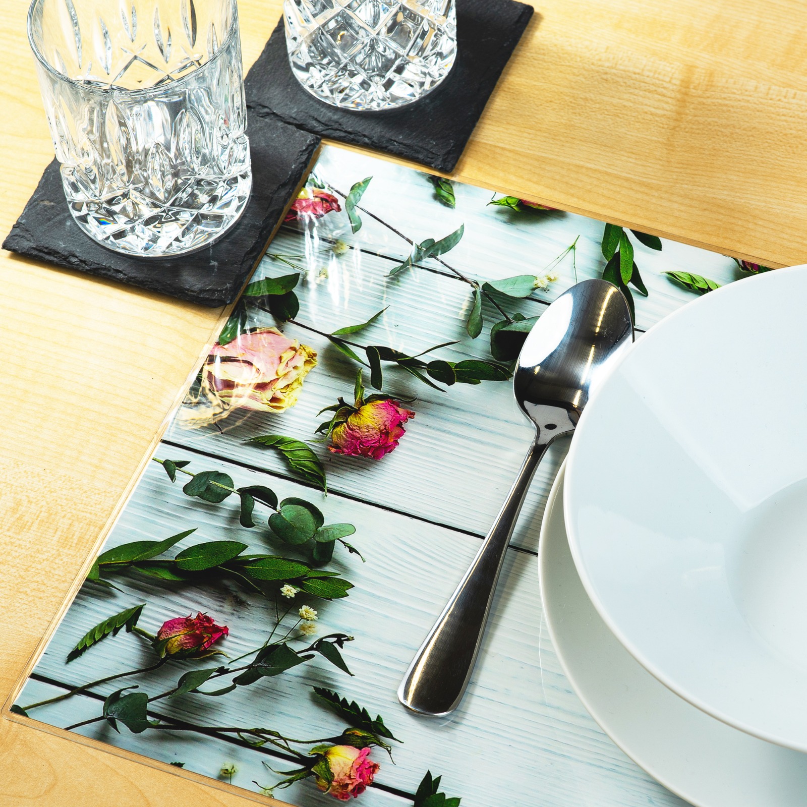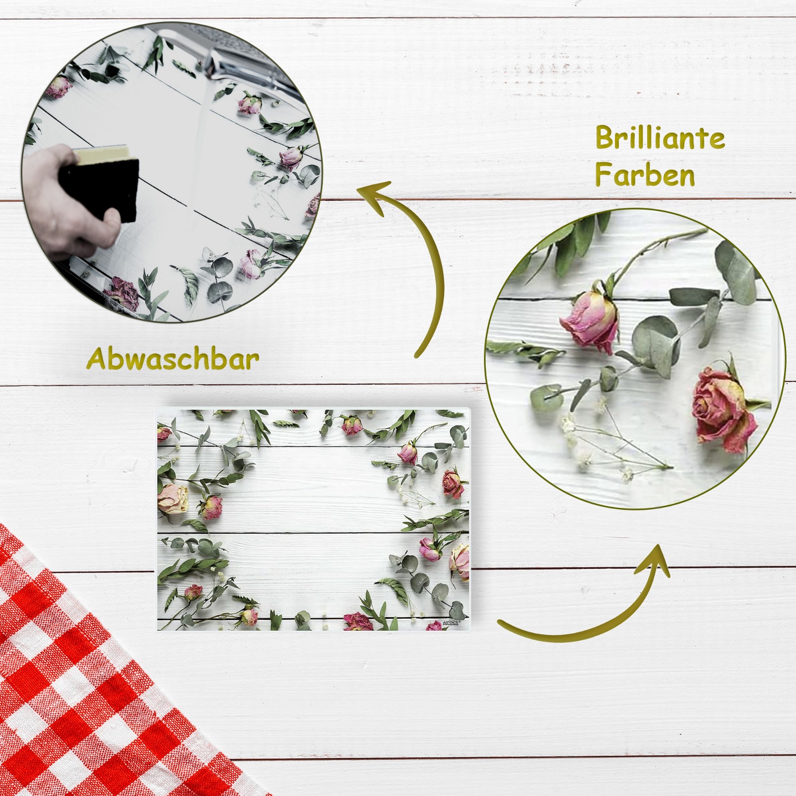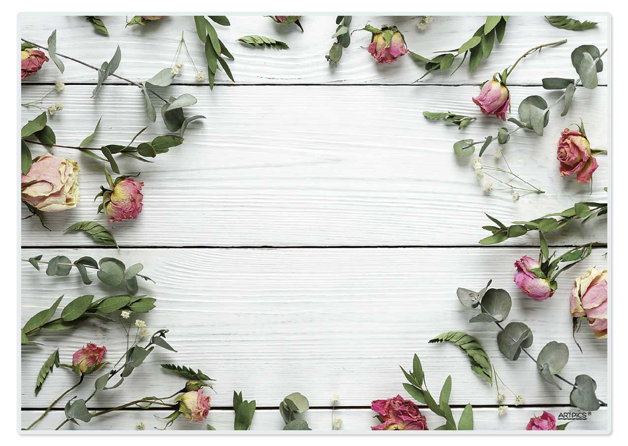 Et voilá: hier rankt sich das Bildmotiv um den Teller, farblich dezent, ein bisschen Landhausstil, ein bisschen romantisch mit getrockneten Rosen, unaufdringlich und trotzdem intensiv in der Wirkung!